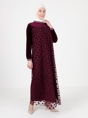 Ginezza Mor Tül Detaylı Desenli Elbise
