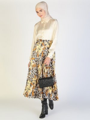 Almera Siyah Kahverengi Çiçek Desenli Etek