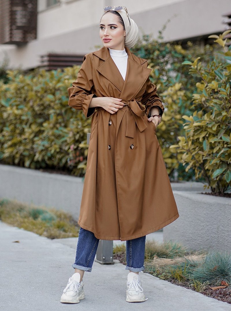 Topless Kahve Kolu Lastik Detaylı Trençkot