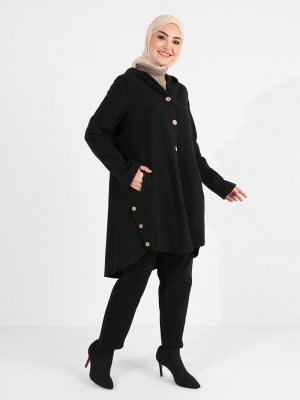Tavin Siyah Düğme Detaylı Kapüşonlu Kaşe Kaban