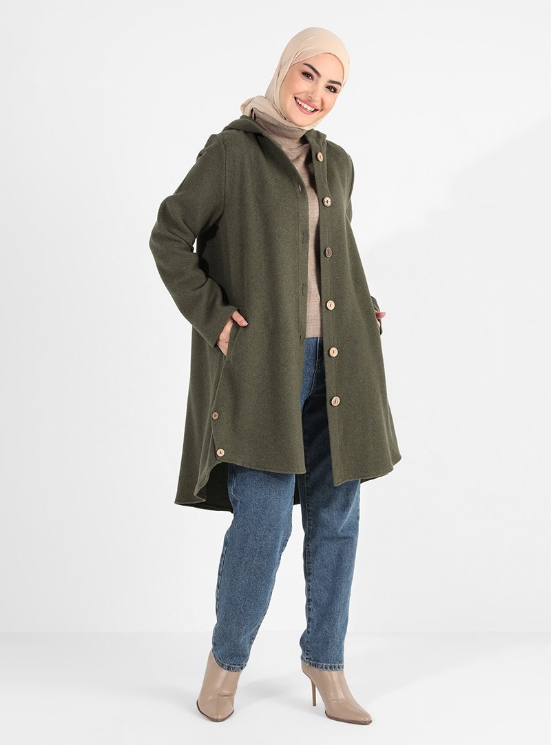 Tavin Haki Düğme Detaylı Kapüşonlu Kaşe Kaban