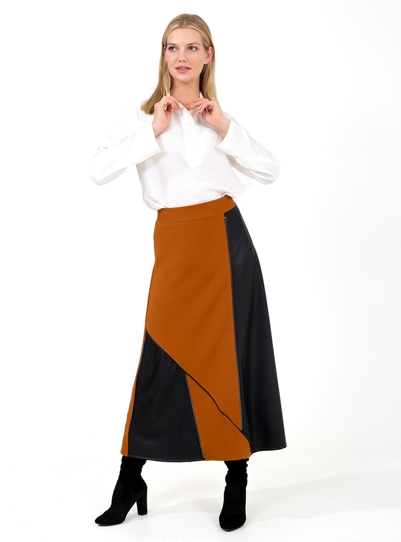 ONX10 Taba Deri Parçalı Fermuarlı Etek