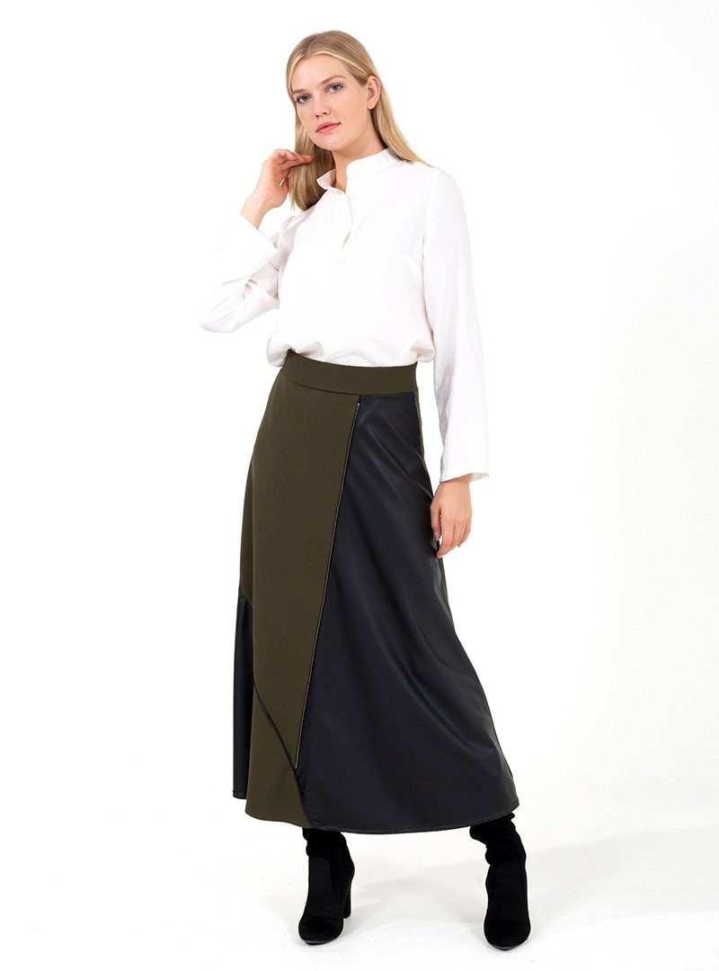 ONX10 Haki Deri Parçalı Fermuarlı Etek