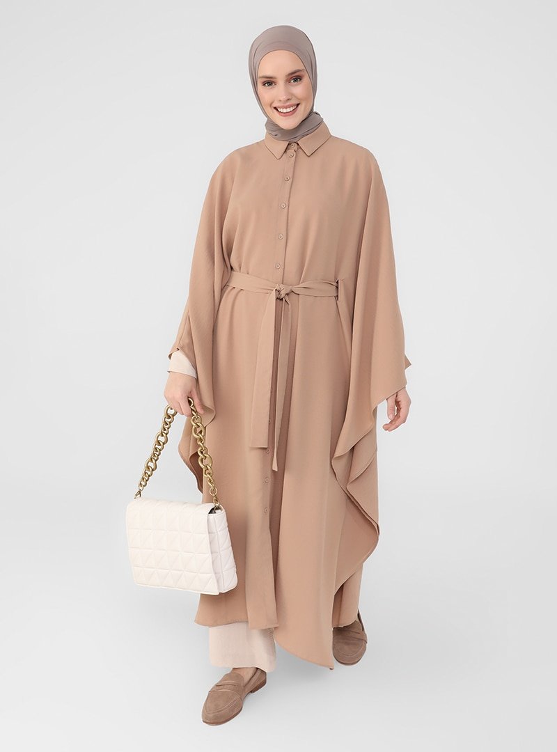 Refka Koyu Bej Kuşaklı Boydan Düğmeli Ferace