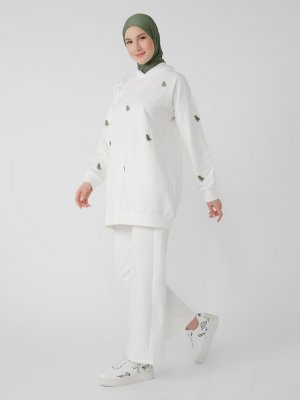 Benin Ekru Nakış Detaylı Tunik & Pantolon İkili Takım