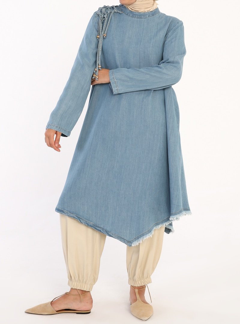 Allday Buz Mavisi Omuz Örgülü Kot Tunik
