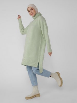 Benin Su Yeşili Boğazlı Yaka Arkası Uzun Triko Tunik