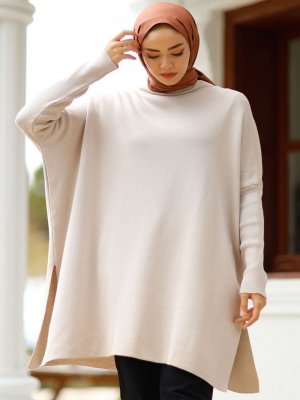 In Style Bej Düz Kelebek Kol Model Triko Tunik
