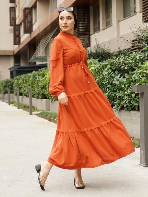 Topless Kiremit Güpür Detaylı Balon Kol Elbise