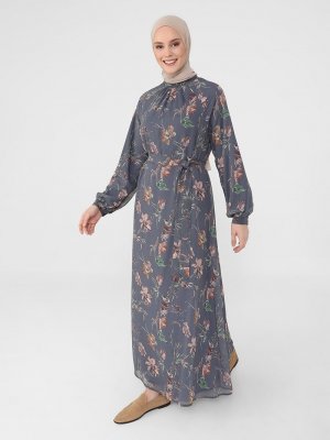 Refka Gri Çiçek Desenli Kuşaklı Elbise