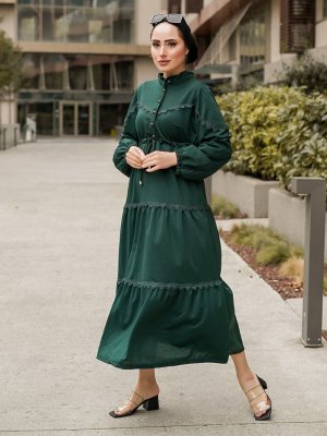 Topless Zümrüt Güpür Detaylı Balon Kol Elbise