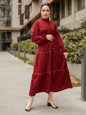 Topless Bordo Güpür Detaylı Balon Kol Elbise