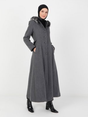 BÜRÜN Gri Kapüşonu Kürk Detaylı Kaban