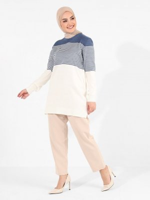 Tavin İndigo Bisiklet Yaka Çizgili Color Blok Detaylı 70cm Triko Tunik