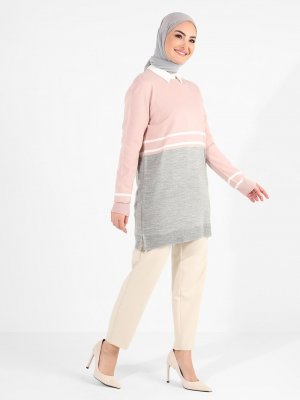 Tavin Pudra Bisiklet Yaka Renk Detaylı 80cm Triko Tunik