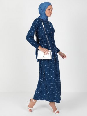 ZENANE İndigo Beli Lastikli Desenli Elbise