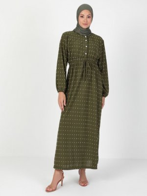 ZENANE Haki Beli Lastikli Desenli Elbise