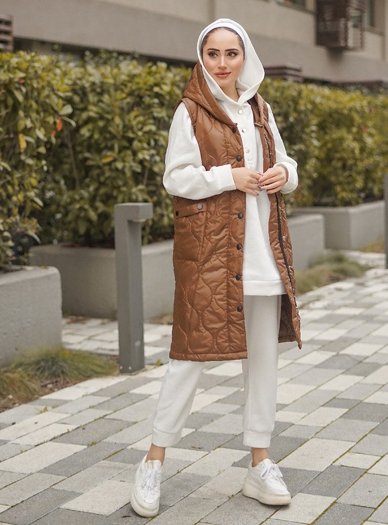 Topless Taba Kapüşonlu Uzun Şişme Yelek