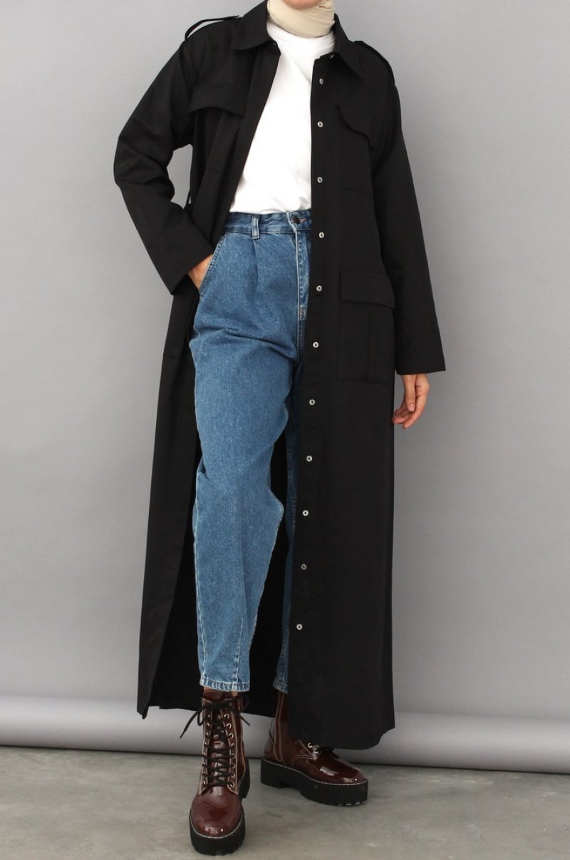 Allday Siyah Körük Cepli Kuşaklı Ferace