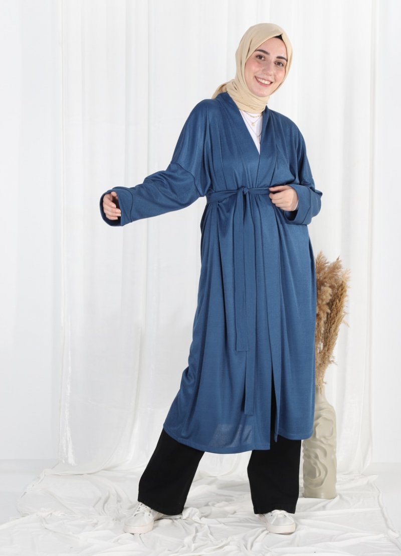 PLİSTRE Saks Kuşak Detaylı Ferace