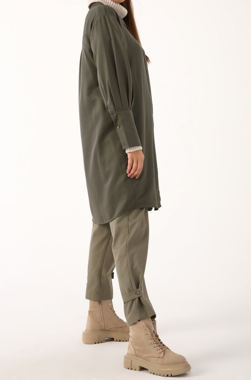 Allday Haki Katlanabilir Manşetli Tam Boy Açılan Gömlek Tunik