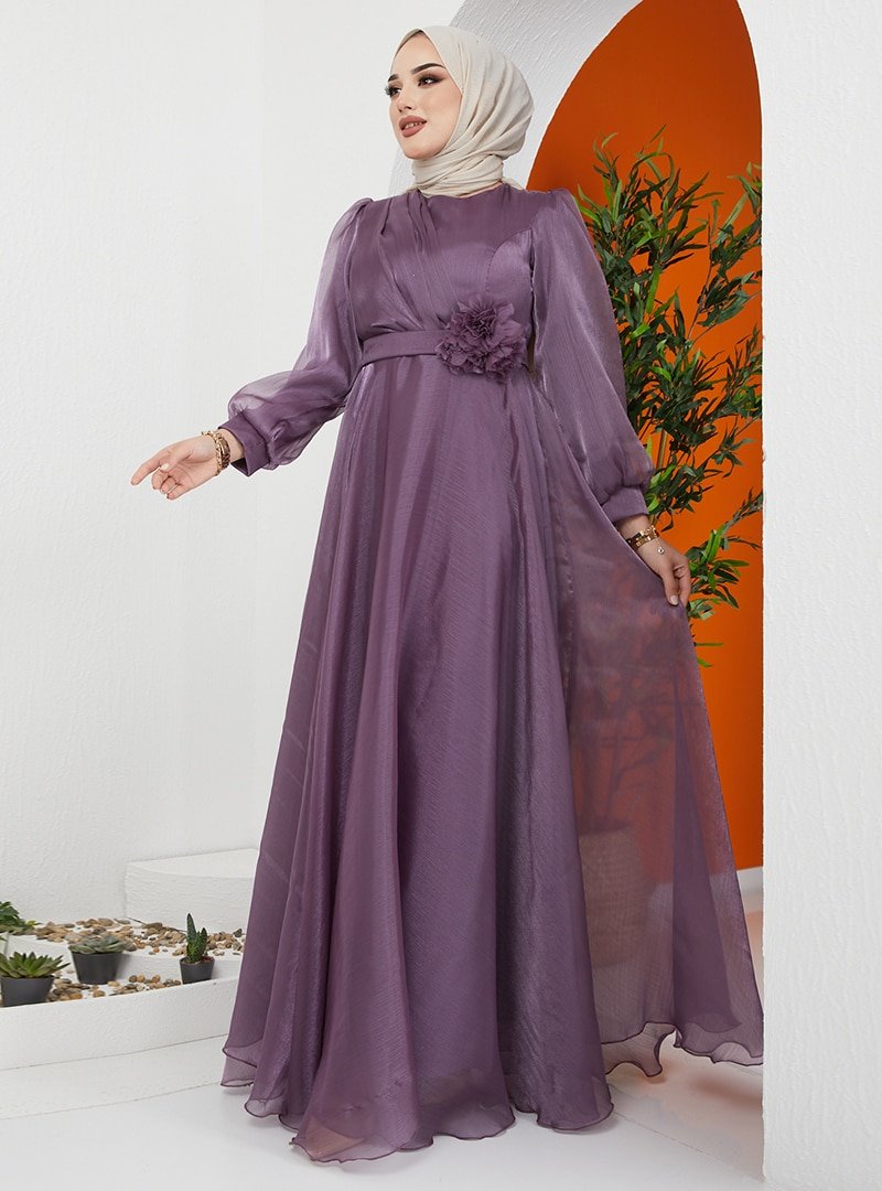 Olcay Koyu Lila Çiçek Detaylı Simli Abiye Elbise