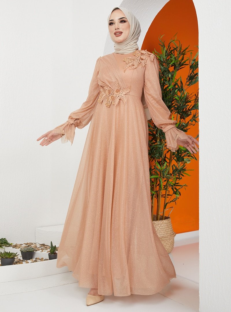 Olcay Somon Çiçek Dantel Detaylı Simli Tüllü Abiye Elbise