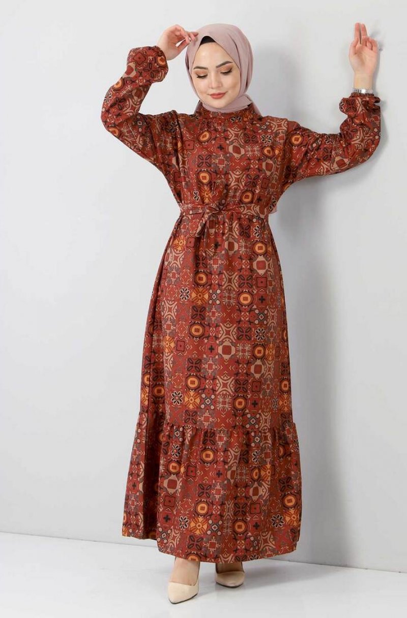 Tesettür Dünyası Kiremit Eteği Volanlı Desenli Elbise