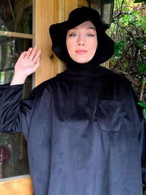Ceylan Otantik Siyah Penye Şal & Kadife Şapka Takım