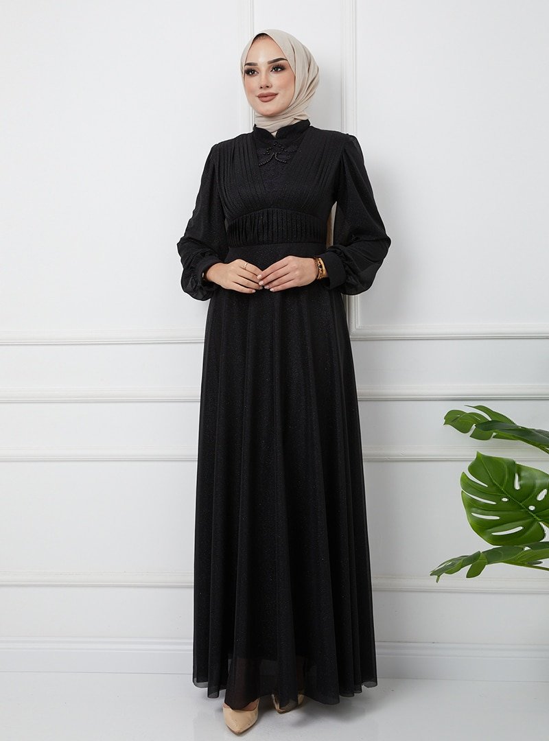 Olcay Siyah Göğsü Beli Piliseli Dantel Ve İnci Detaylı Simli Abiye Elbise