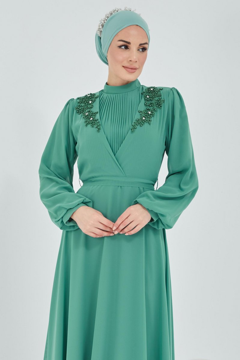 Moda Echer Mint Önü Pilise Omuzları Güpür Ve İnci Detaylı Abiye Elbise