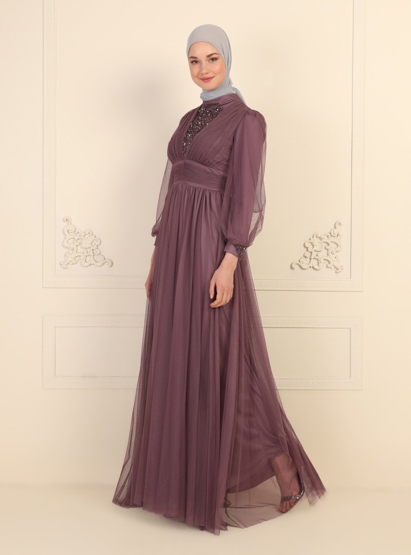 MODAYSA Lila Tül Ve Aplik Detaylı Abiye Elbise