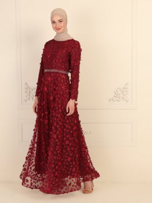 ENSANUR MODA Bordo Gül Kabartmalı Abiye Elbise