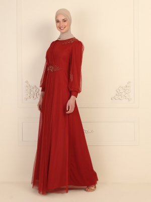 MODAYSA Kiremit Helen Tül Detaylı Abiye Elbise