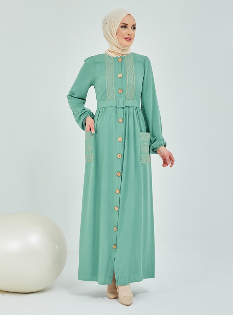 Topless Su Yeşili Kalın Kemerli Nakışlı Elbise