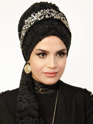 AİŞE TESETTÜR Siyah Payetli Hazır Türban