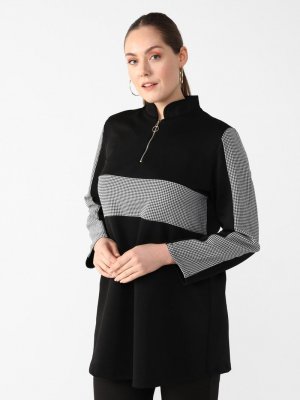 Alia Siyah Büyük Beden Yakası Fermuarlı Kazayağı Desenli Tunik