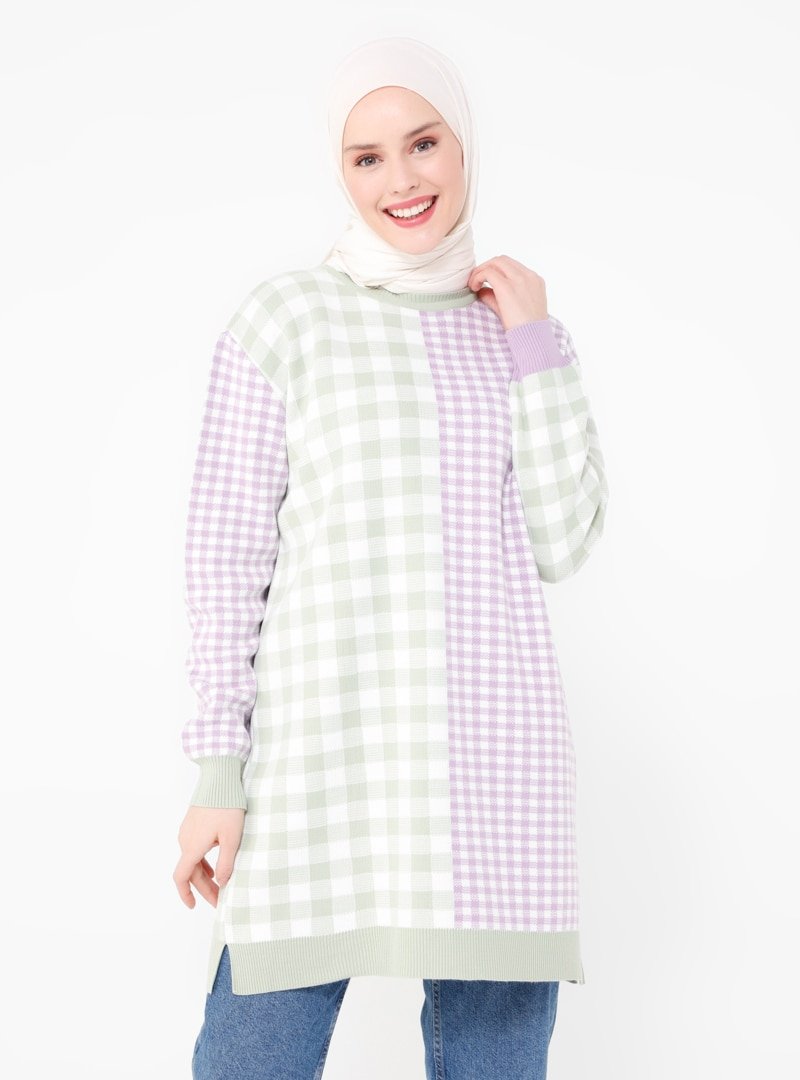 Benin Çağla Kare Desenli Triko Tunik