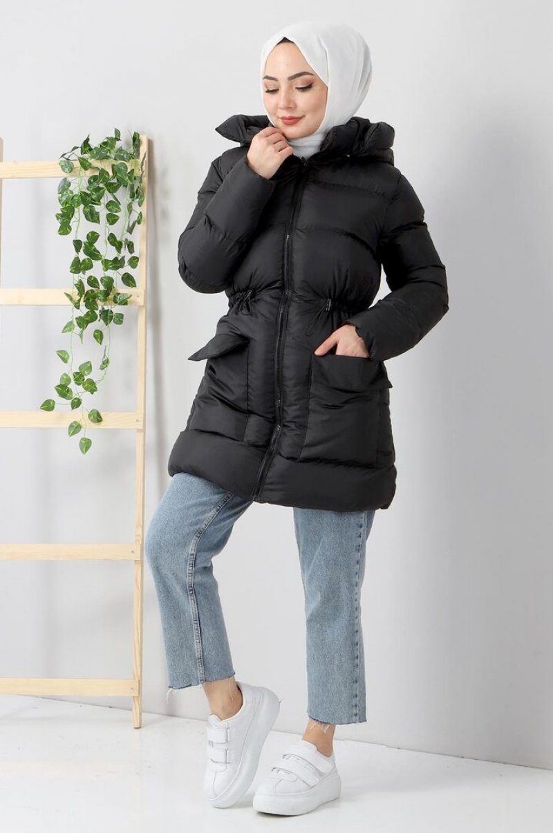 Tesettür Dünyası Siyah Cepli Şişme Mont