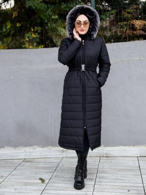 Sevit-Li Siyah Kapüşonu Kürklü Şişme Mont