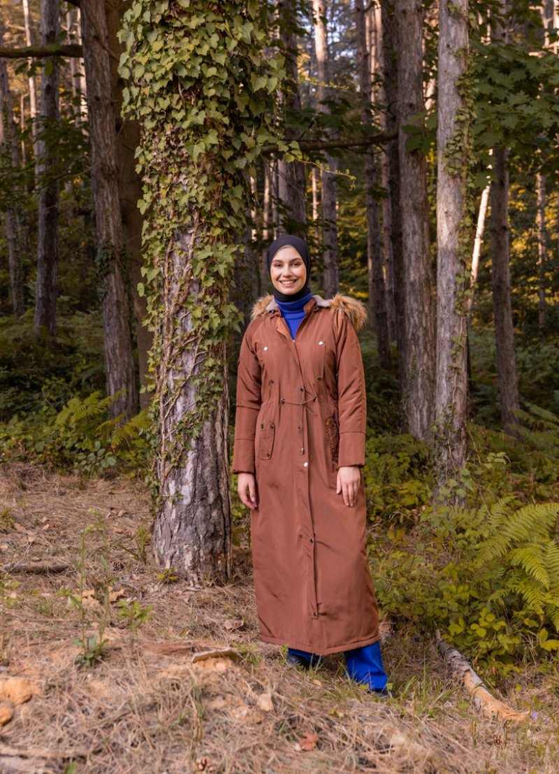 Olcay Taba Kapüşonu Kürk Detaylı Manto
