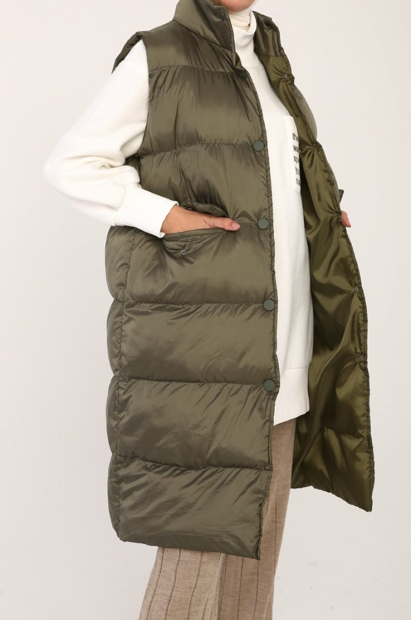 Allday Haki Cepli Çıtçıtlı Dik Yaka Uzun Şişme Yelek