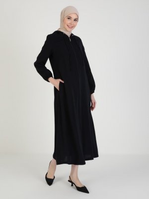 ENSANUR MODA Lacivert Kapüşonlu Boydan Fermuarlı Ferace