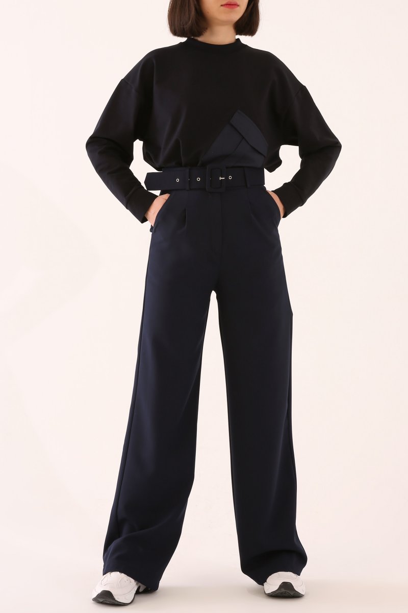 Allday Lacivert Kemerli Bol Paça Pantolon