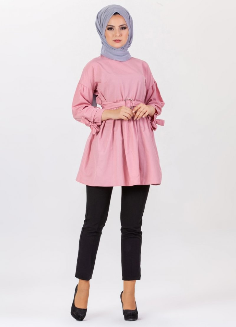 Topless Pudra Kemer Detaylı Pileli Tunik