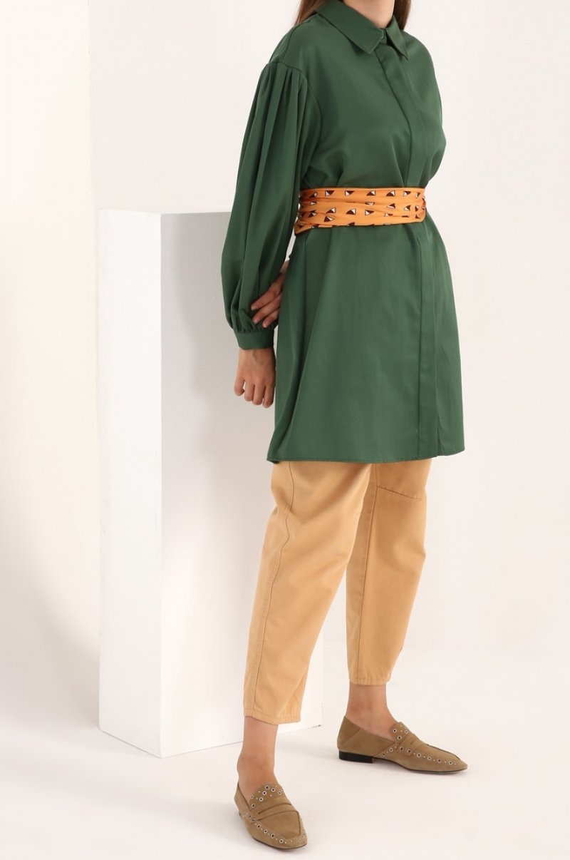 Allday Yosun Yeşili Kolları Pileli Önü Düğmeli Rahat Kalıp Gömlek Tunik