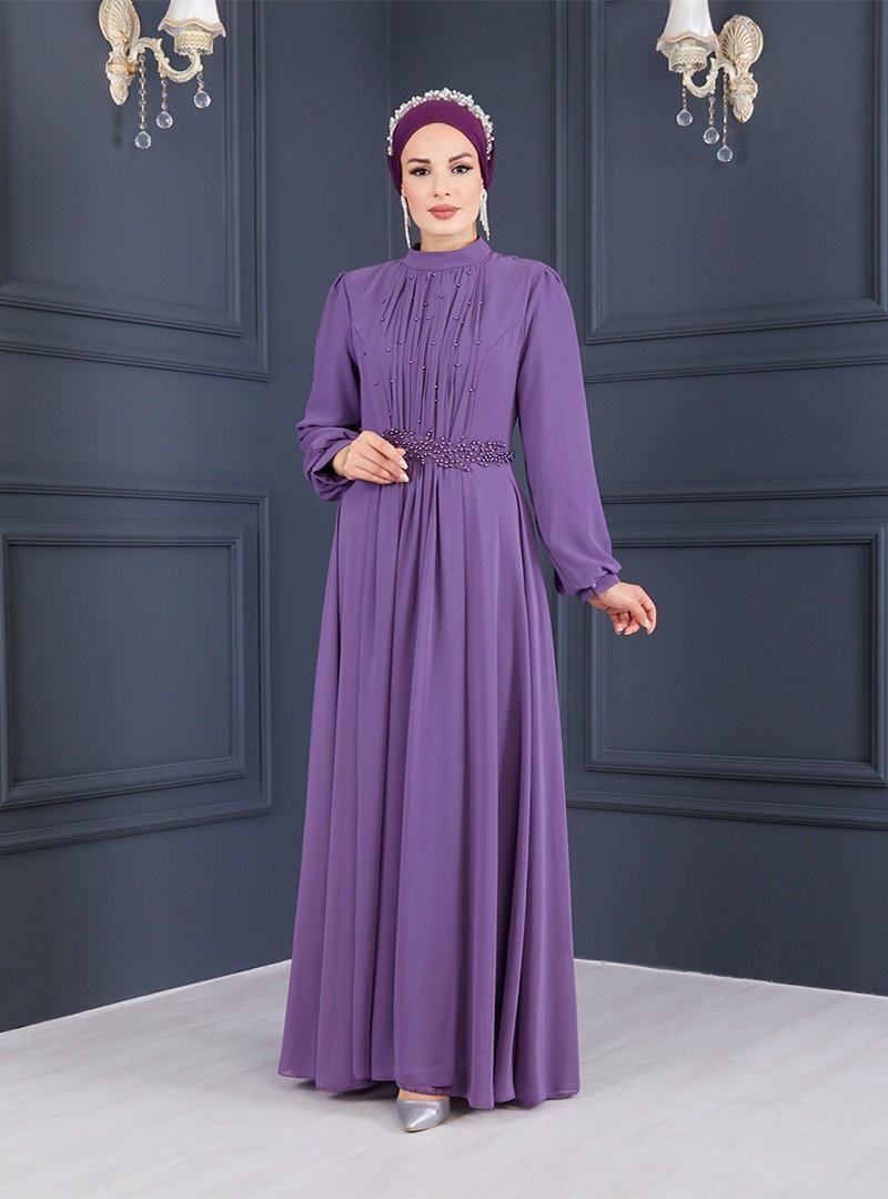 Moda Echer Lila İnci Detaylı Güpür İşlemeli Abiye Elbise