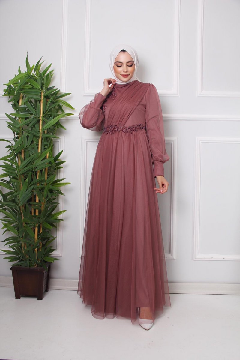 Moda Echer Abiye Elbise Tül Dantel Aksesuarlı Gülkurusu