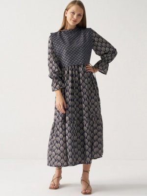 SoftandBasic Çok Renkli Desenli Önü Robalı Büzgülü Elbise