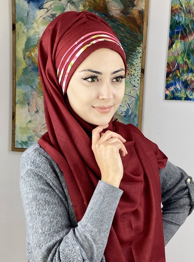 BUTİK AMBAR Koyu Bordo Çiçekli Asimetrik Drapeli Hazır Şal